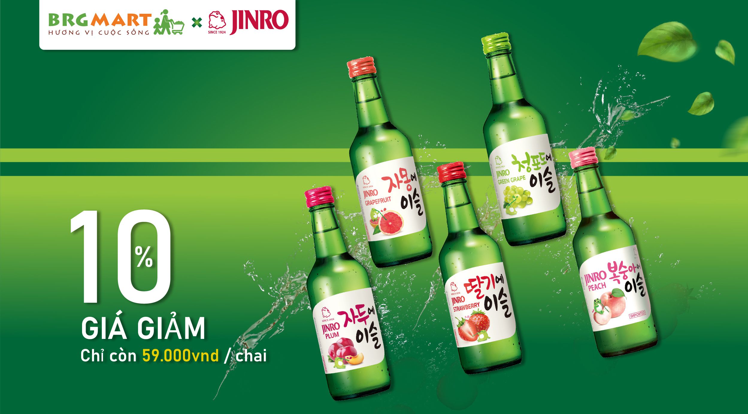 Đồng hành cùng BRGMart 2 năm qua, Jinro đã phục vụ cho các bữa tiệc của khách hàng tại BRG Mart 1 cách trọn vẹn. Để tri ân tới khách hàng, nhãn hàng Jinro Soju đang có chương trình giảm giá 10%, áp dụng cho các vị rượu soju trái cây bao gồm: vị bưởi, nho, mận, dâu và đào. Giá giảm còn 59.000 VNĐ/ chai. Set 03 chai rượu Jinro Soju vị trái cây bất kỳ giảm từ 195,000 VNĐ/ set 🡪 169,000 VNĐ/ set.