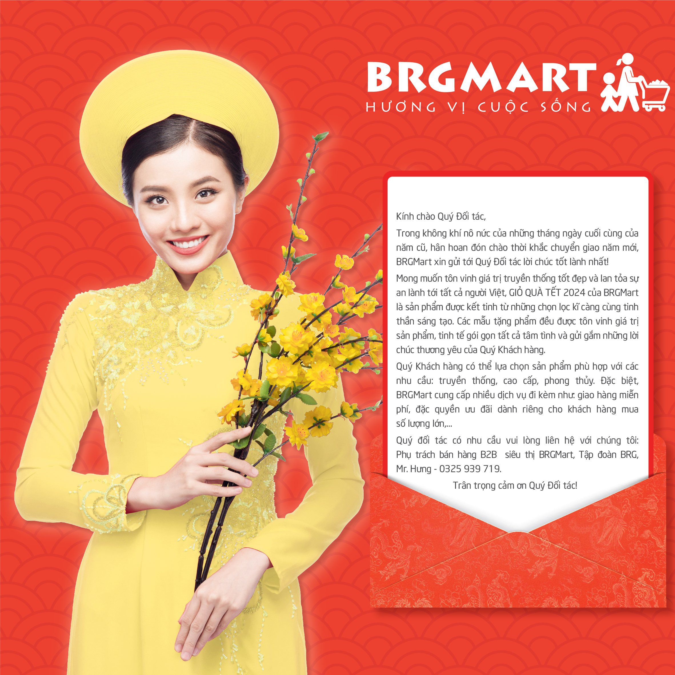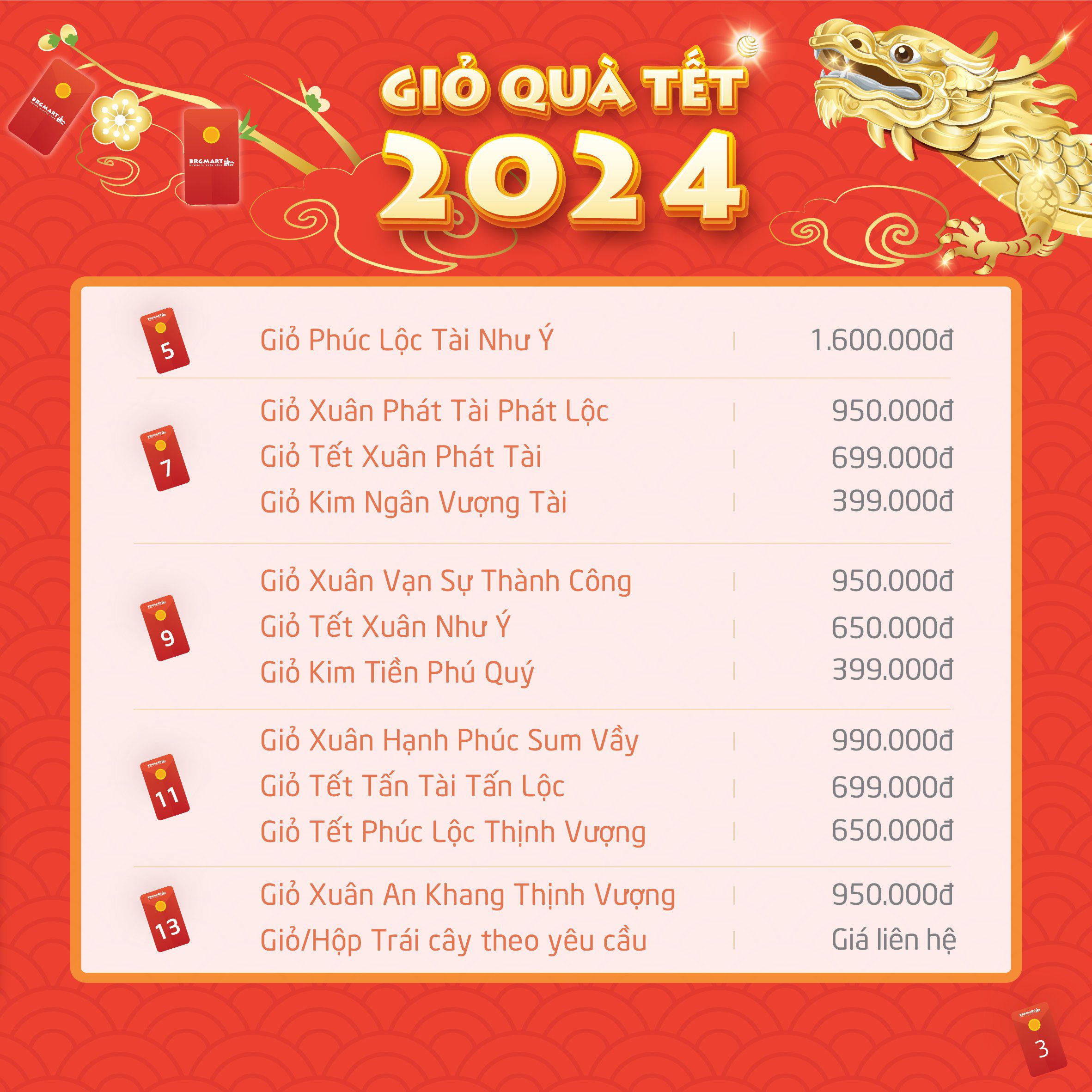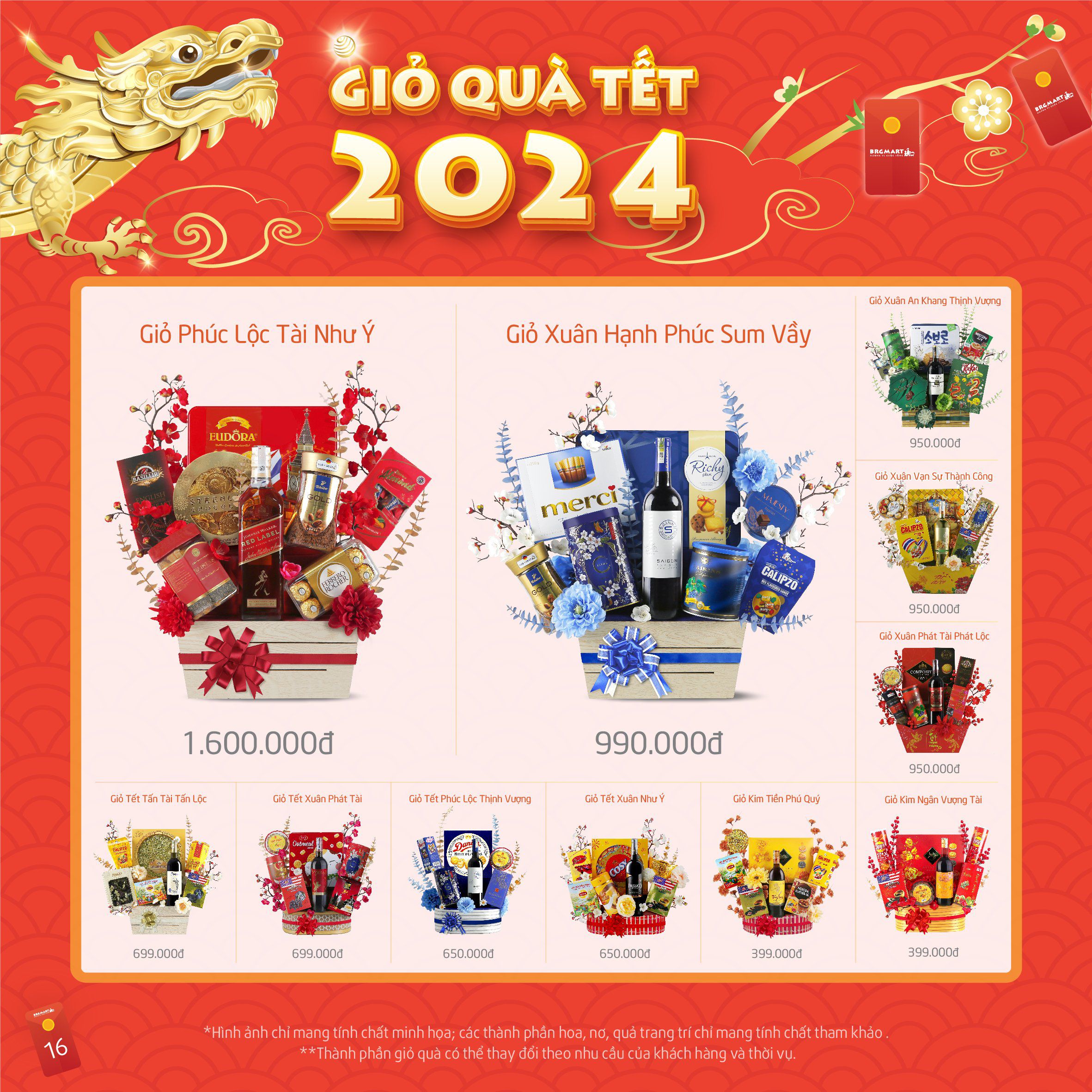 Mong muốn tôn vinh giá trị truyền thống tốt đẹp và lan tỏa sự an lành tới tất cả người Việt, GIỎ QUÀ TẾT 2024 của BRGMart là sản phẩm được kết tinh từ những chọn lọc kĩ càng cùng tinh thần sáng tạo. Các mẫu tặng phẩm đều được tôn vinh giá trị sản phẩm, tinh tế gói gọn tất cả tâm tình và gửi gắm những lời chúc thương yêu của Quý Khách hàng.