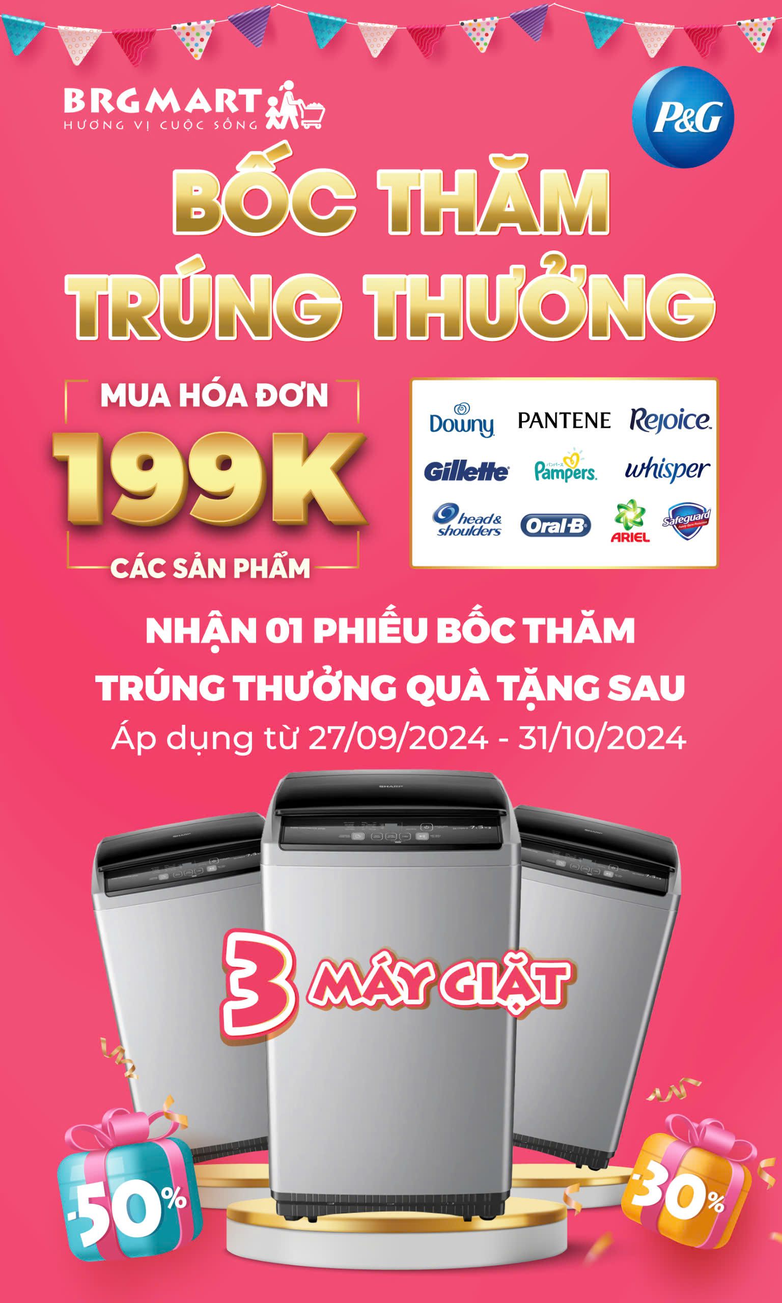 Hệ thống siêu thị BRGMart xin gửi lời cảm ơn chân thành đến quý khách hàng đã đồng hành cùng chương trình “SINH NHẬT VÀNG – NGÀN ƯU ĐÃI” diễn ra từ ngày 27/09 đến hết ngày 31/10/2024. Khi mua hoá đơn có các sản phẩm của nhãn hàng P&G với giá trị hàng hoá đơn trên 199,000đ, quý khách hàng sẽ được nhận ngay 1 phiếu bốc thăm trúng thưởng.