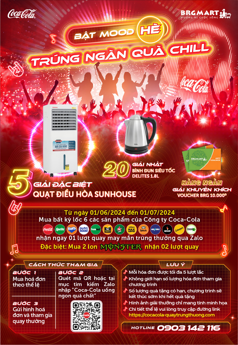 Từ ngày 01/06/2024 đến ngày 01/07/2024, khi mua lốc 6 bất kỳ các sản phẩm của thương hiệu Coca-Cola tại hệ thống siêu thị BRGMART/FUJIMART trên toàn quốc nhận ngay 1 lượt quay may mắn trúng thưởng...